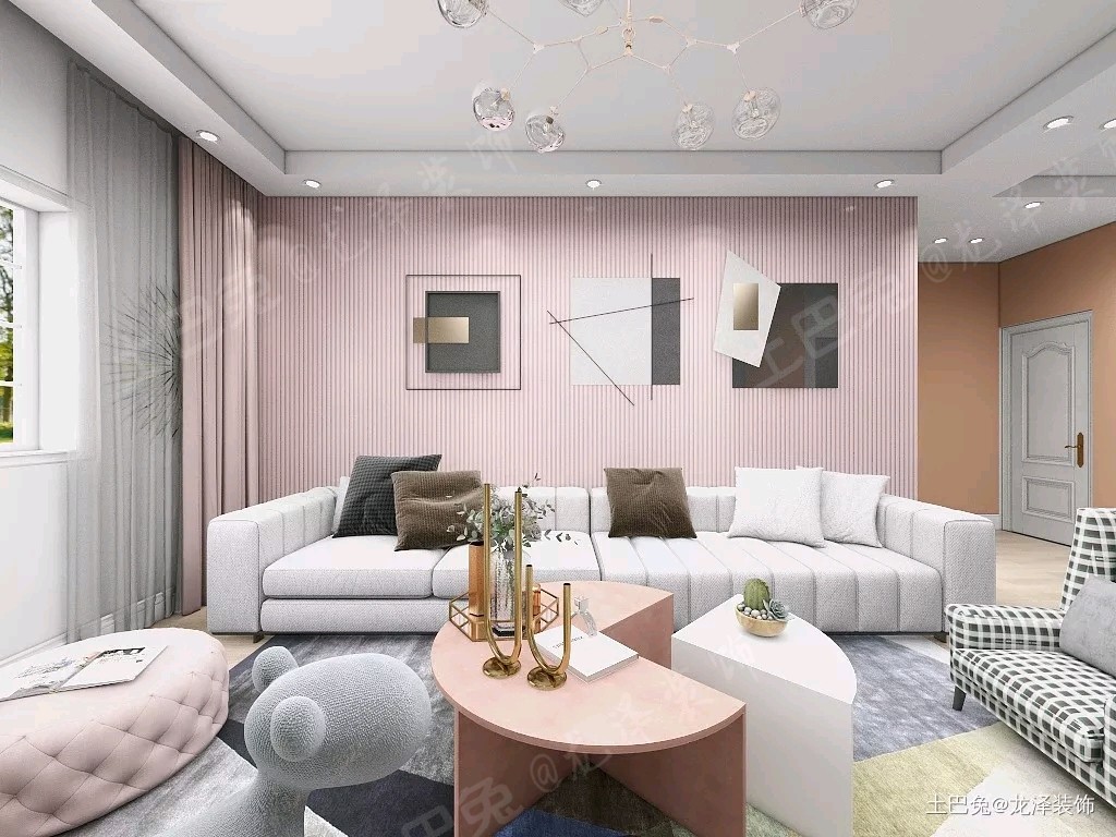 沙发背景墙以粉色长城板为主,上面做简单的三 组挂画,将沙发配以白色,这样更能提亮整个房 间的亮度。