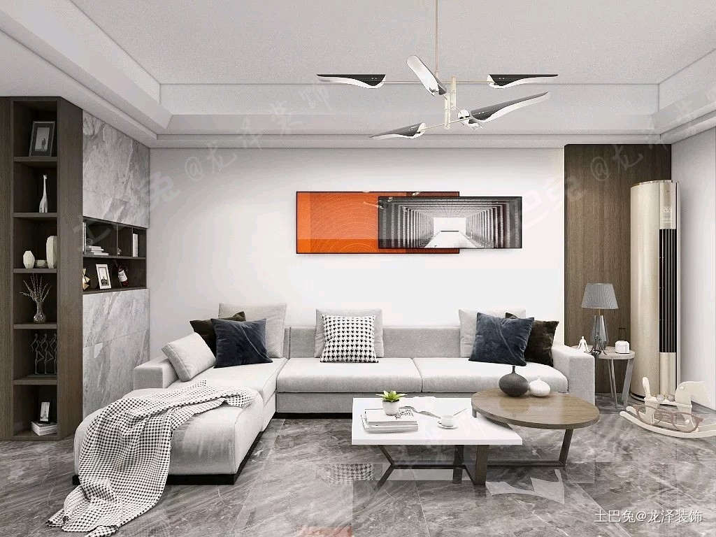 沙发背景墙则采用木饰面与原墙面相结合,这个 在收口上则是对我们的一大挑战,所以我们在收 口上作了***的收口处理,挂画采用一个爱马仕 橙的颜色,给白色的墙面上增添了些许灵动的感 觉。