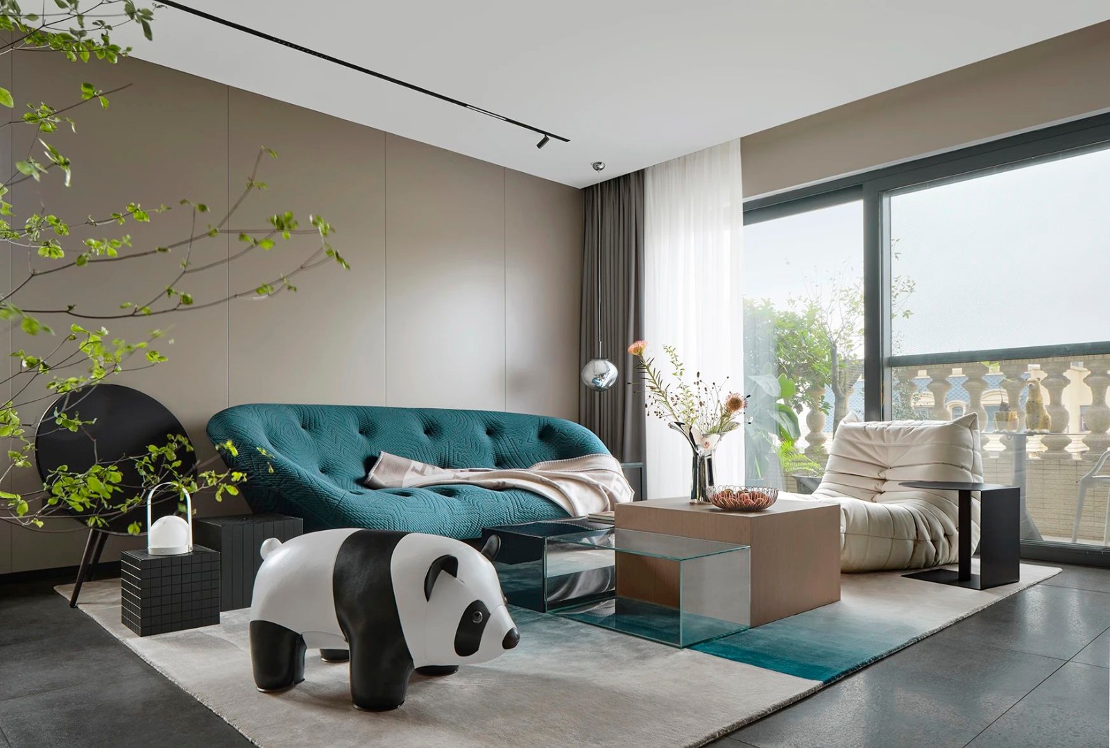 造型前卫而不失温润感的NATUZZI茶几,孔雀蓝地毯与沙发相呼应,空间内的物件彼此都互融自洽。萌态可掬的Zuny大熊猫,则为原本静怡的空间增加了几分愉悦与轻松感。