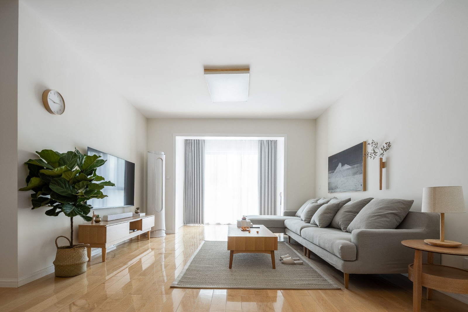 进入室内,客厅与阳台联动互通,视觉的纵深感随之而来,空间因此拥有了良好的采光和通透性。