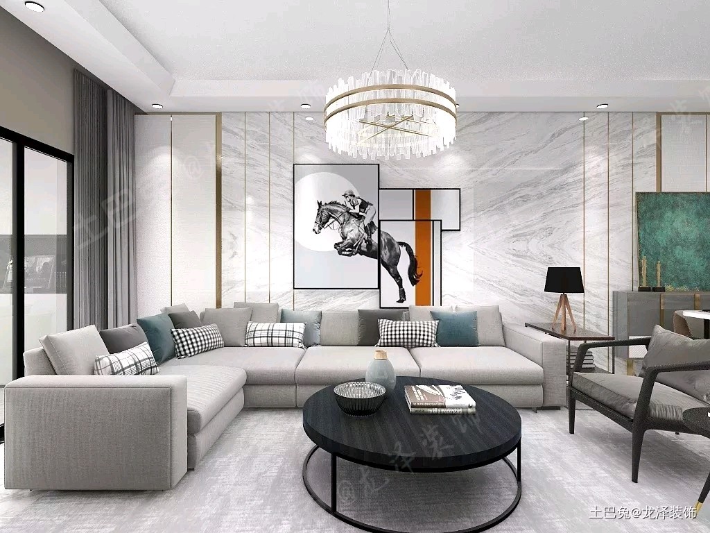 电视背景墙运用深色长城板加白色爵士白大理石 瓷砖而成,并在中间掏出电视原有的尺寸,这样 方便电视无缝拼接。顶面的吊灯则采用水晶圆形 吊灯,此吊灯的优点则是光照强度大,并且装饰 性极好。