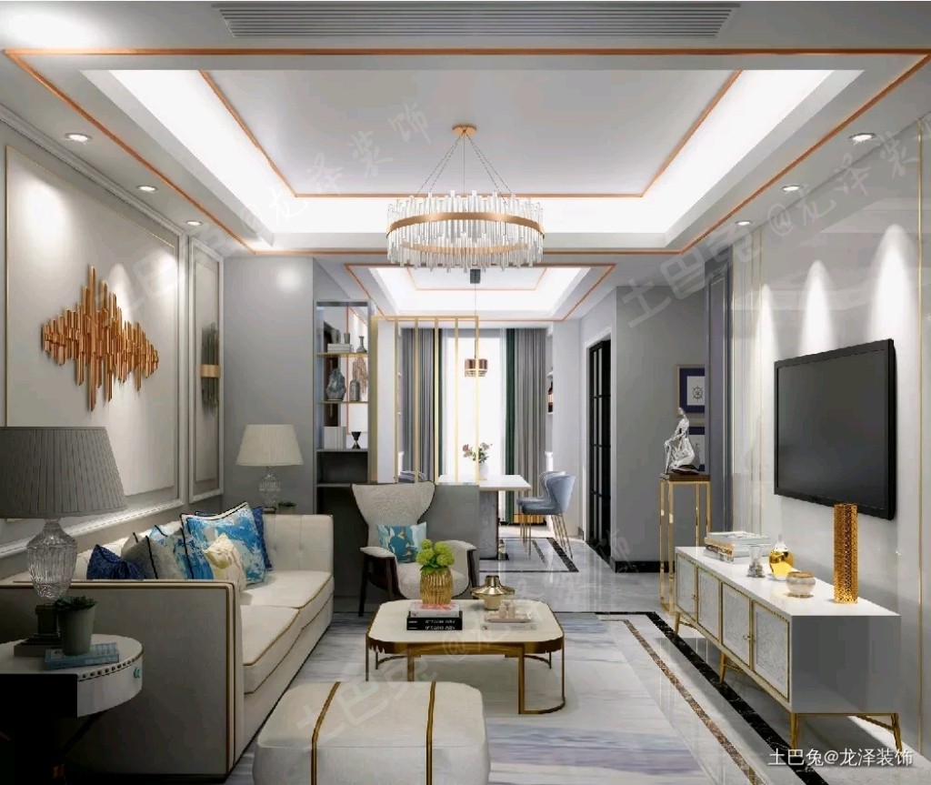 呈现在您眼前的是客厅电视背景墙的一个效果, 结合男主人和女主人的简约和轻奢风,电视背景墙没有做的太花哨,两边木饰面,中间大理石上墙,用女主人喜欢的金属线条来抽槽作为点缀,整个电视背景墙顿时显得比较高大上,简约里透着小资的感觉,华而不夸张,简单而大气,本来还想着两边木饰面中再设计***壁灯,后来这个壁灯的方案也被否掉了他们觉得太累赘了,还是觉得素一点比较好,这样看着比较大气。为了整体效果