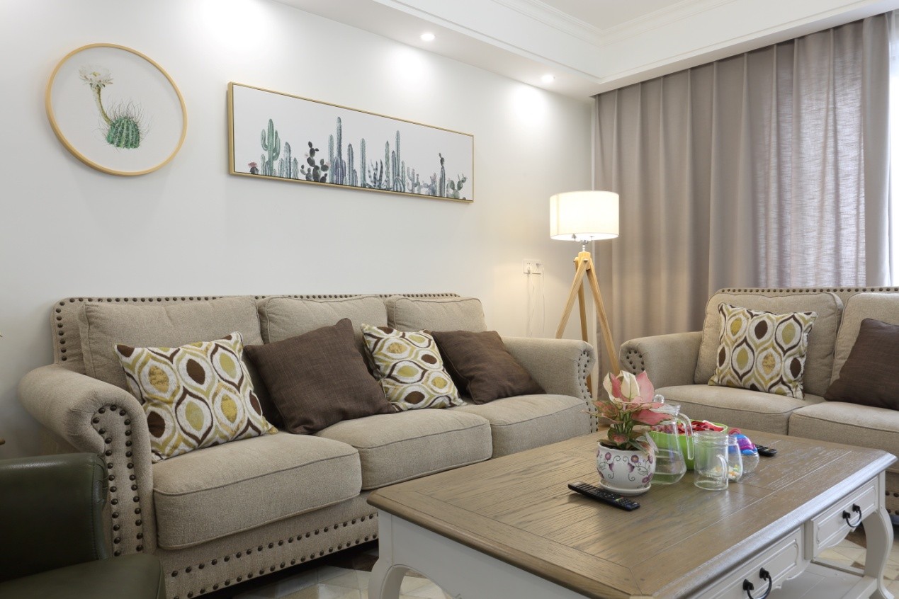 客厅选用了大面积的浅色系,例如卡其色的沙发和温和的木地板,营造一个温暖和谐的家庭环境。墙面不做过多装饰,只有一幅圆形和矩形的挂画,拥有大量留白的简约感,同时又具有一定的设计感。