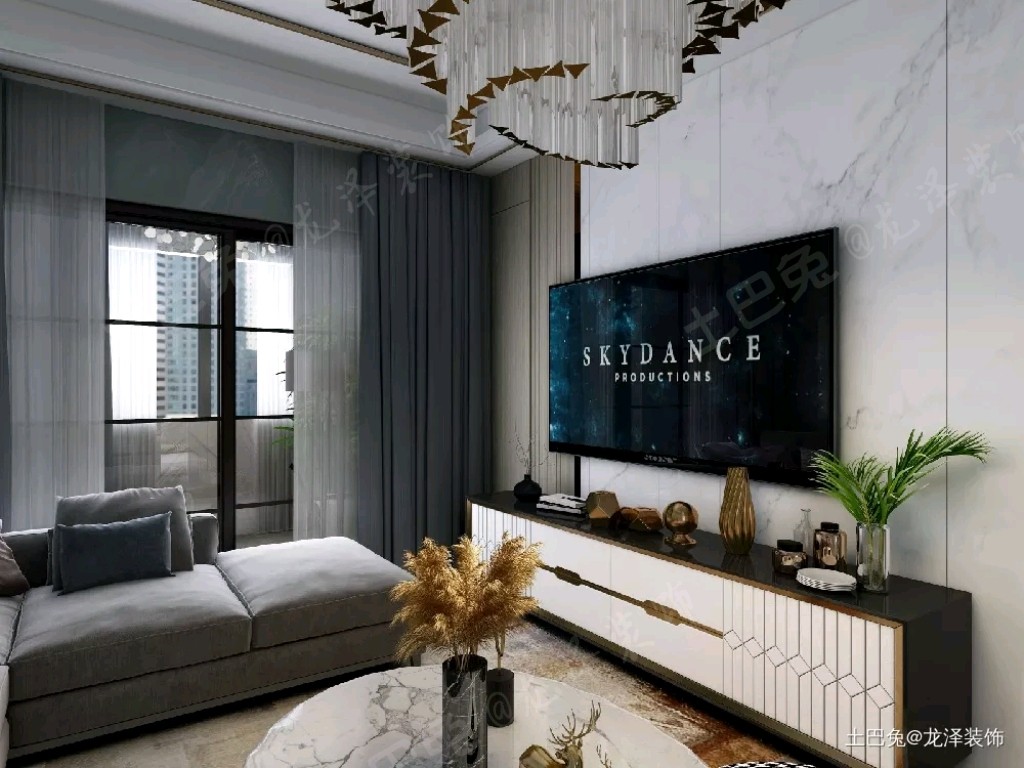 电视背景墙采用爵士白大理石,配以水晶吊灯。