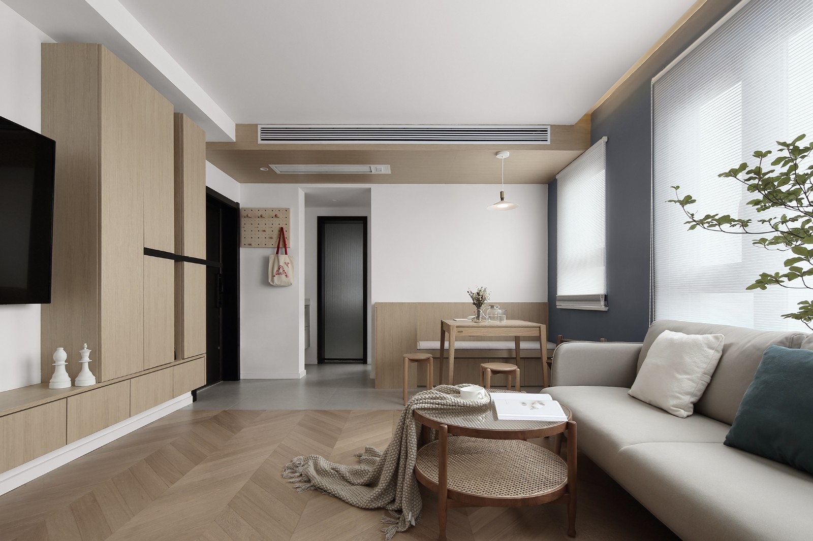整体原木色的电视柜兼门厅柜,一块黑色条板穿插入柜体,即刻打破了柜体的单调和呆板,设计感凸显,条板上可以摆放进出门时的包包、钥匙等小件,看似简单却满满小心思。