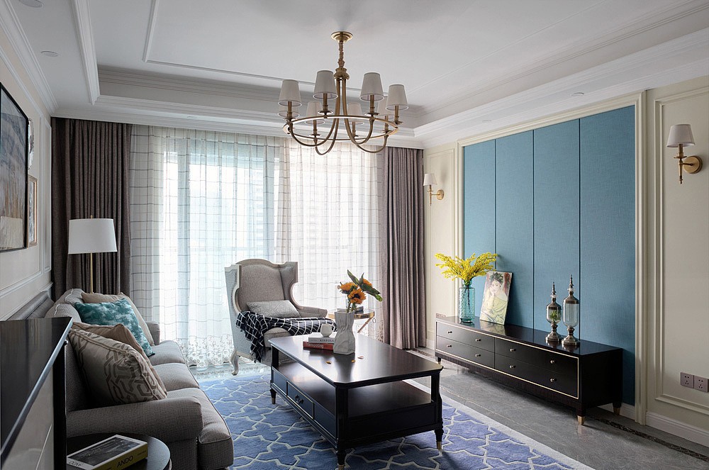 客厅搭配精致的古铜式的吊灯,营造出一种怀旧与浪漫的基调。