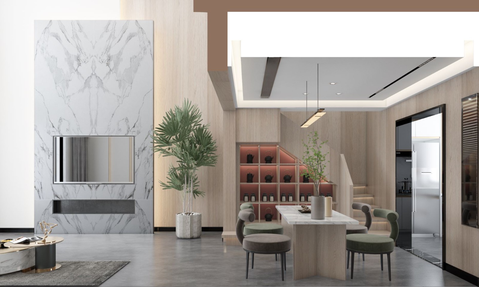 超大岩板电视背景墙。木制楼梯。墙面板材+韩国进口LG贴膜。