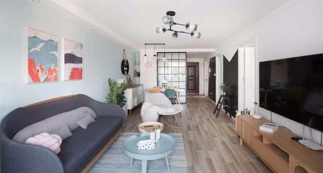 ▲客厅紧凑的面积下以文艺的双拼圆形茶几,木质电视柜与圆弧边的灰色布艺沙发,淡蓝色的沙发墙上挂两幅手绘装饰画,一眼看过去满满的文艺雅致感。