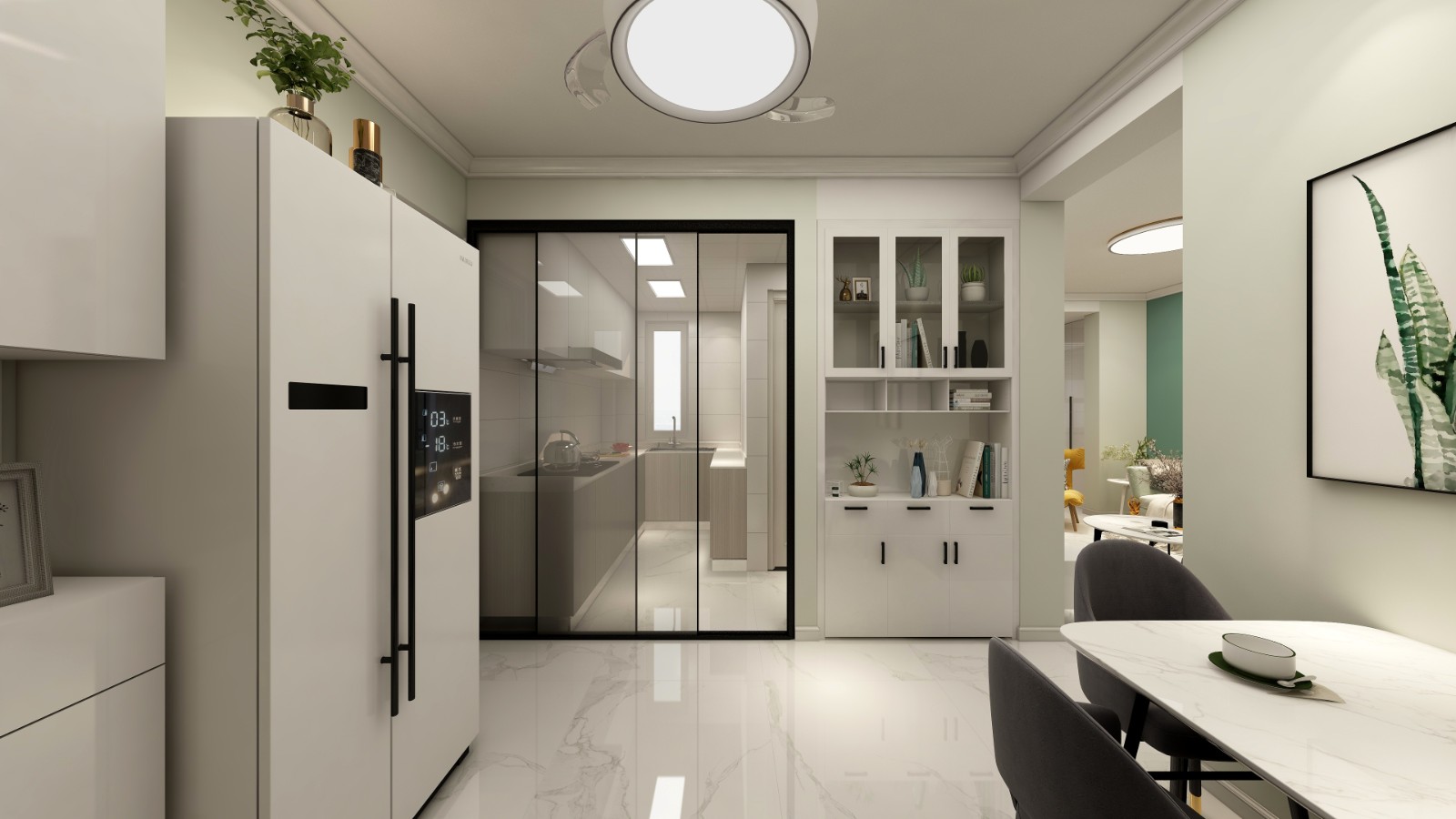入户正对着的餐边柜用来遮挡卫生间的门,高度与厨房移门一致空间整体性更强。