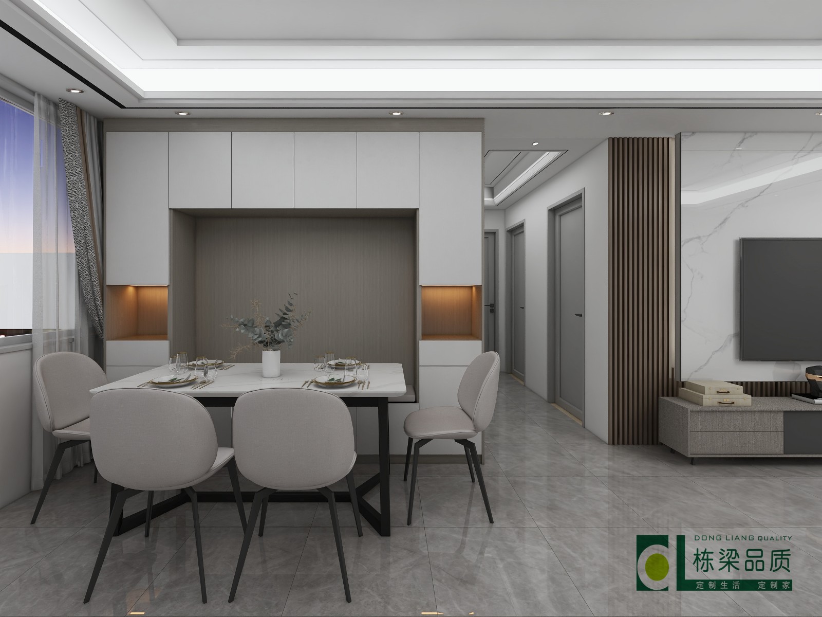 入户鞋柜,亮点在客厅餐边柜,卡座+餐边柜一体设计,节约空间的同时又不影响整体可观性。