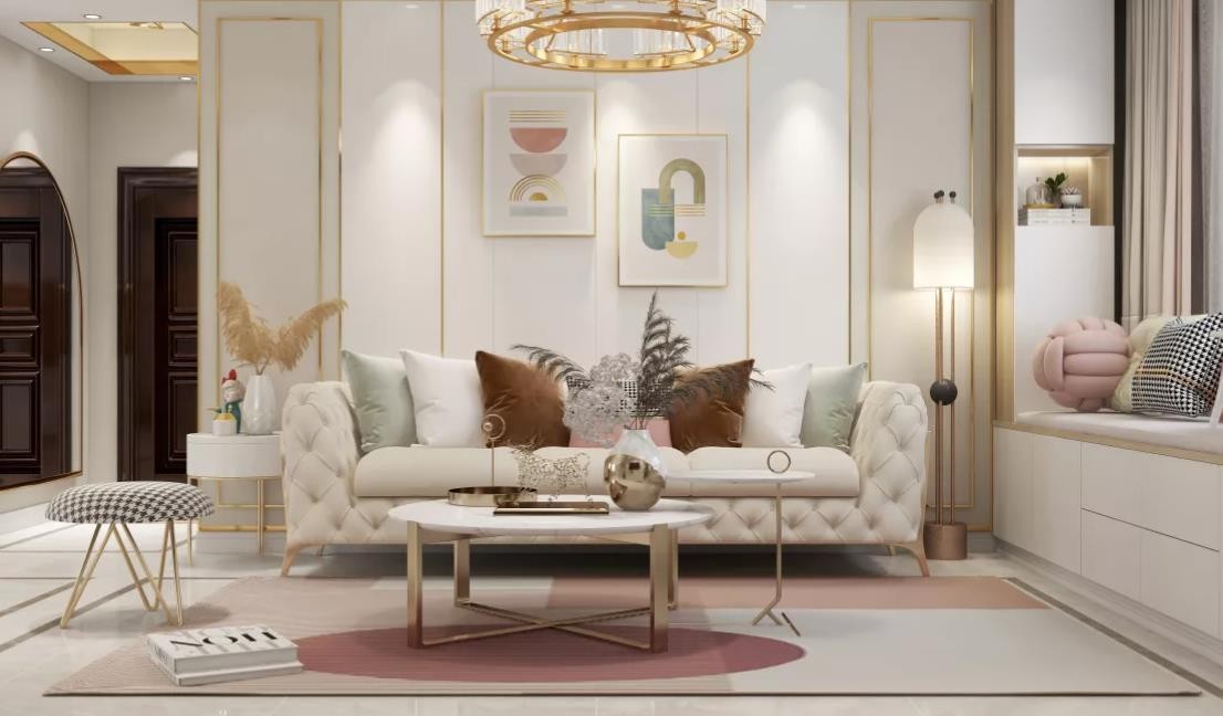 室内采用平实自然的空间基调,奶咖搭配白色的沙发背景墙,让整个空间尽显温柔