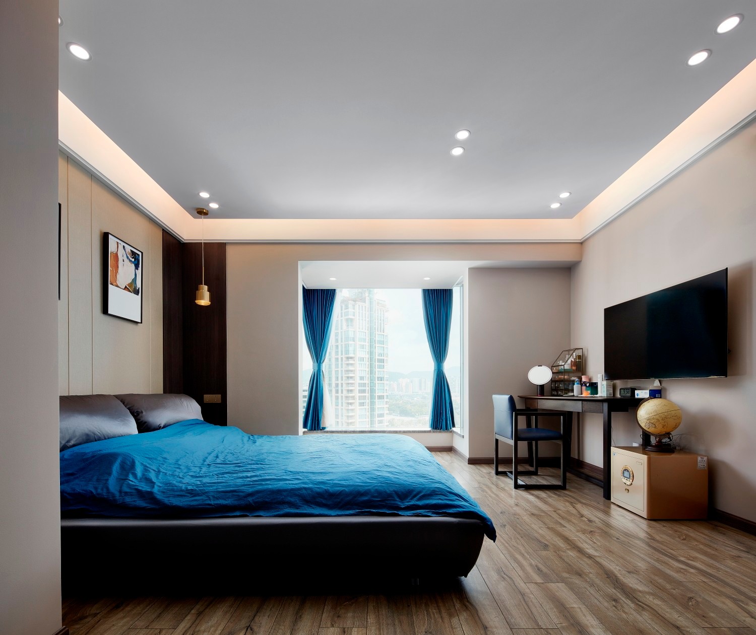 卧室休息区整体是现代简约设计,融入带有***质感的中性色调,通过巧妙混搭让空间气质得以提升,尽显现代时尚优雅的风范。