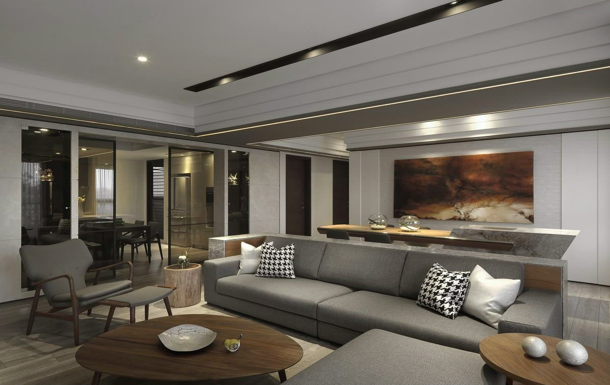 客厅和餐厅连而不断又各自分区,整体以黑白灰为主色调,点缀木色增加温馨质感。