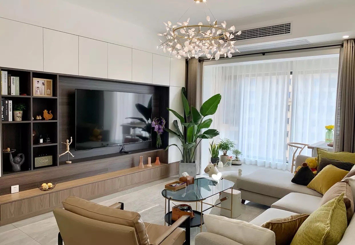 因为户型较小,所以电视墙做了柜子,收纳装饰两用。