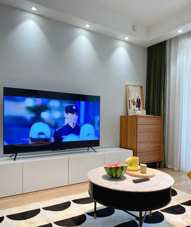 电视柜选用的颜色为纯白色,更加贴合区域氛围。圆形的茶几选用黑白配色调,为空间增添色彩。电视柜旁边放置原木斗柜,与氛围不突兀的同时可以增加收纳空间。