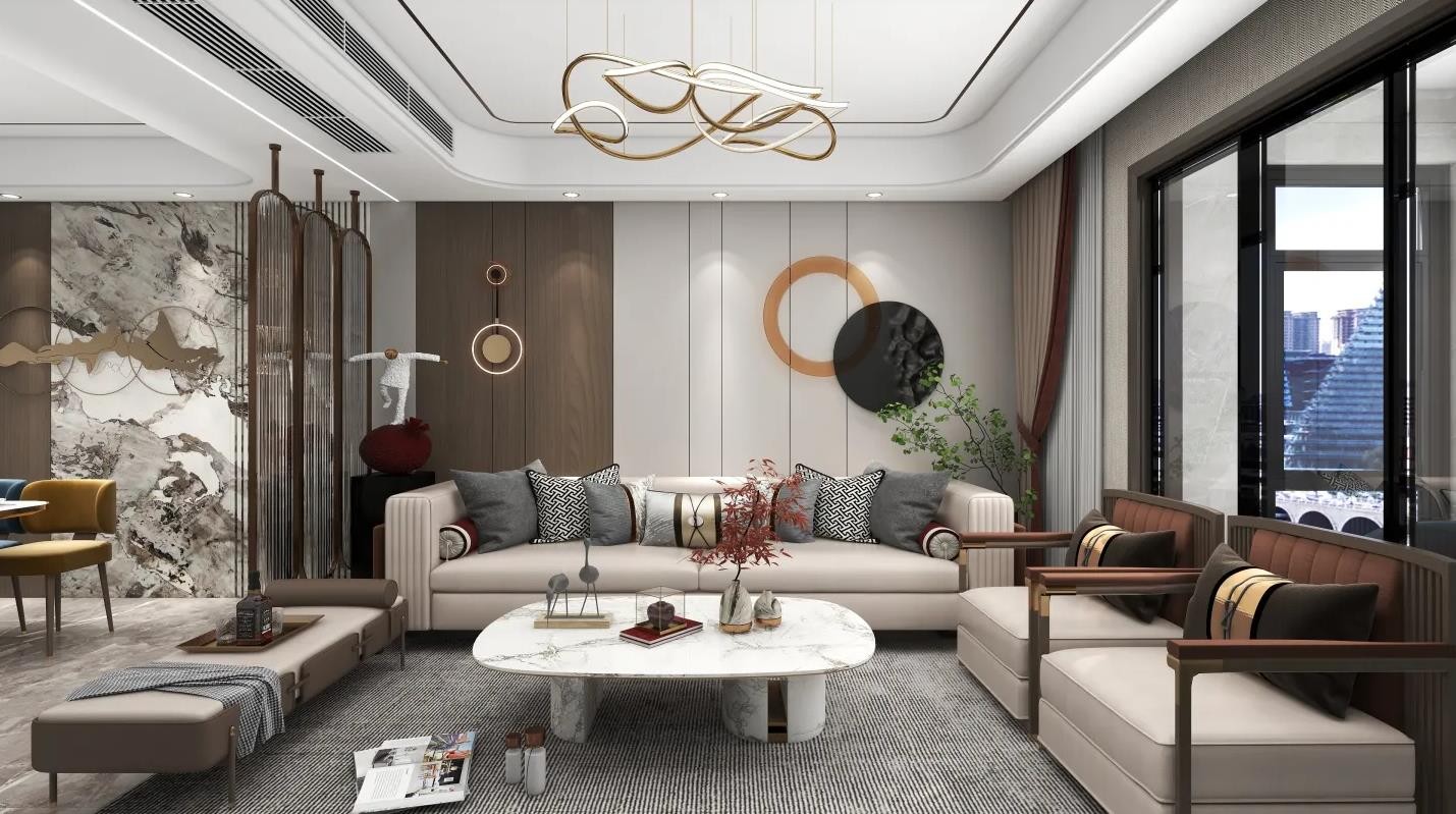 新中式风格的客厅,木质家具为主,不同于中式的实木家具,整体大气。