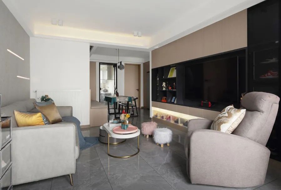 电视墙定制了嵌入式收纳柜,开放格与封闭柜的组合,藏露有序,感十足。