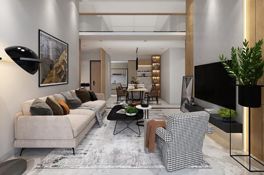 客餐厅按业主要求,采用无主灯设计,设开放式厨房,加宽客厅的原木格栅及地台,使其公共区域视野空间感更加宽阔大气舒适。