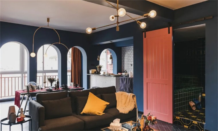 拆除大部分墙体重建,全屋以深蓝为基础,焦糖色为辅,并融入水磨石、小方砖、拱门、谷仓门等流行元素,风格调性上打破传统的北欧、原木风,提取当下时尚弄潮儿们的活力状态,打造出这套富有个性与仪式感的房子