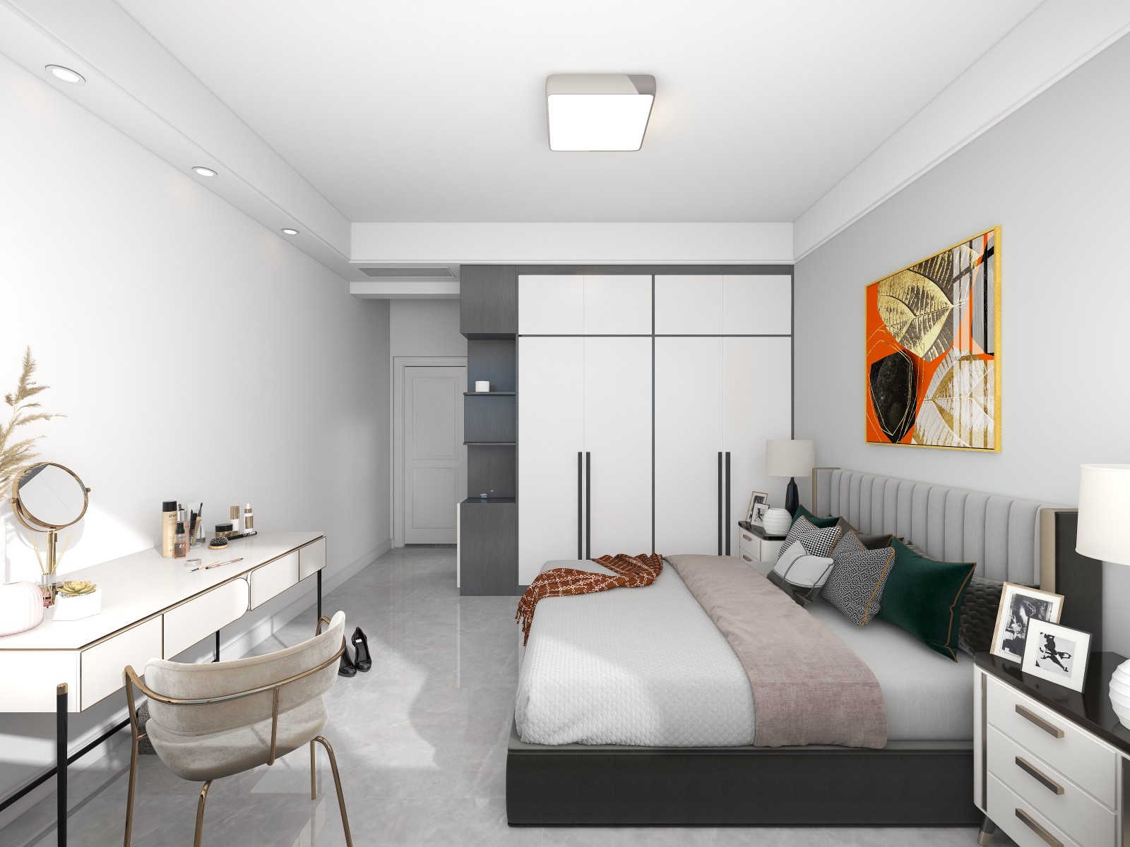 主卧依旧延续主体色,用床头挂画点缀