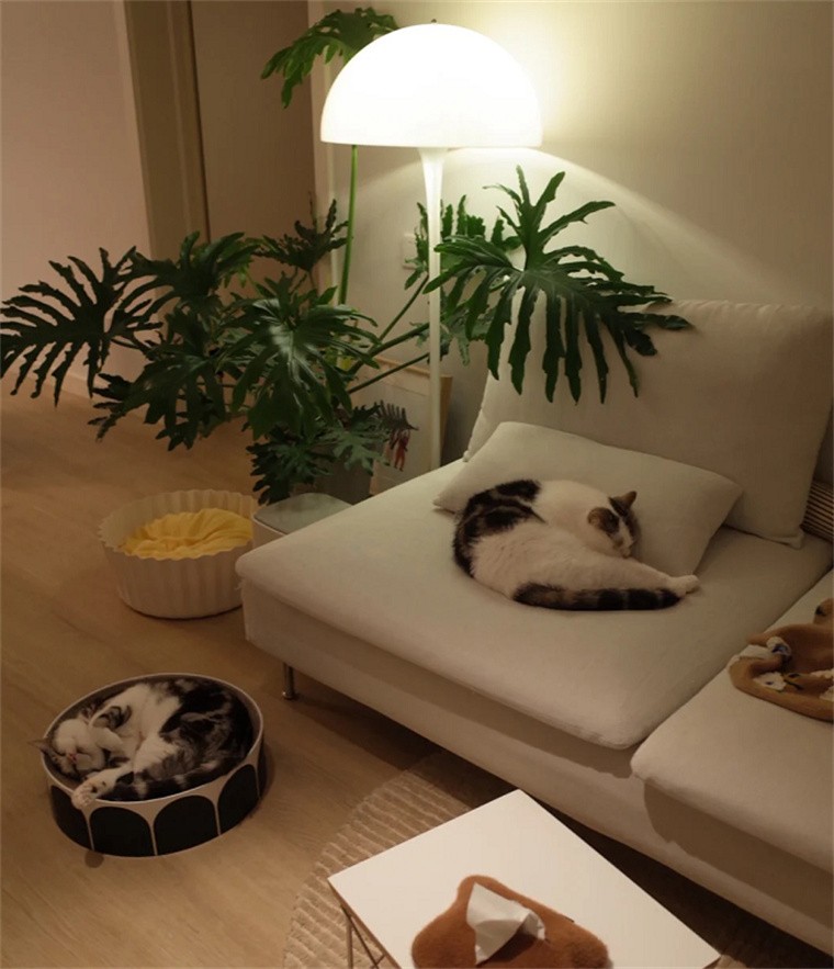 沙发是业主和爱宠最喜欢停留的区域,因为客厅空间面积较大,可以放置猫抓板以及其他工具。