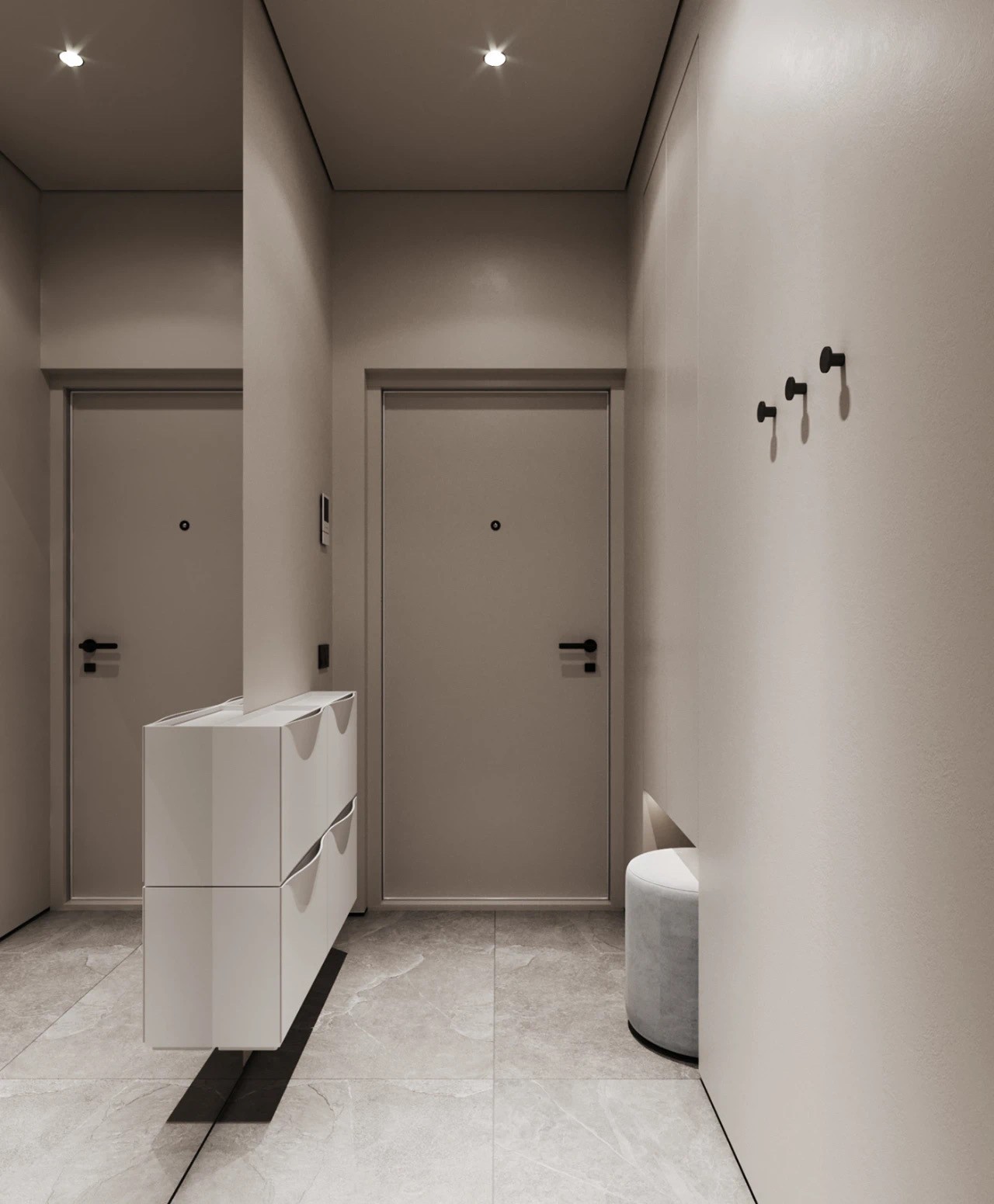 进门左手边定制了顶天立地的收纳柜,下面留出方格放置换鞋凳,还做了藏灯式设计,让回家更有仪式感。