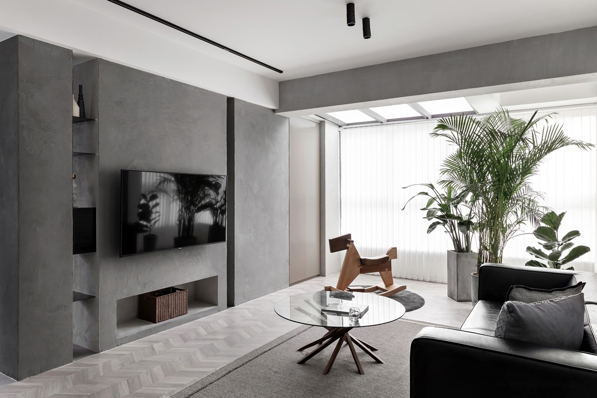 设计师通过鱼骨拼的地板,和客户自己diy的电视背景墙的工业艺术漆两个材质进行碰撞,也就形成了特有的工业+现代风格表现。