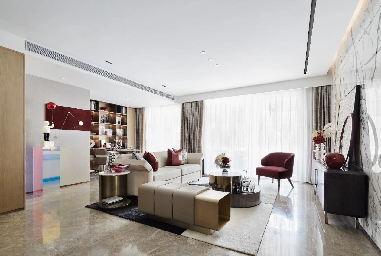 在典雅的米金色彩基调中,设计师大胆选择了兼具浪漫和野性的红色,大理石背景板具有更加自由和大块的纹理,随机出现的黑色和金色象征原始的自然。