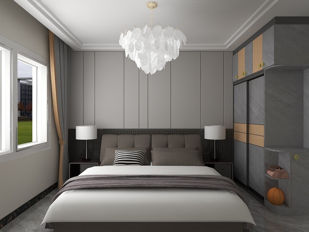 主卧整体清新时尚,灰色橘黄的配色,浪漫的飘窗,符合男女主人的身份和审美。