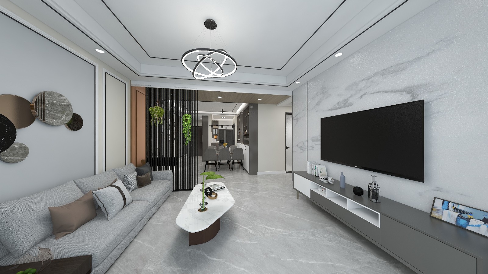 餐厅部分满顶,客餐厅以木饰面相连,平衡餐厅与客厅的比重