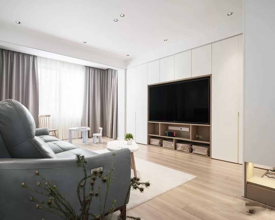 客厅空间无主灯设计,客厅与大阳台连通后家庭活动空间更大。