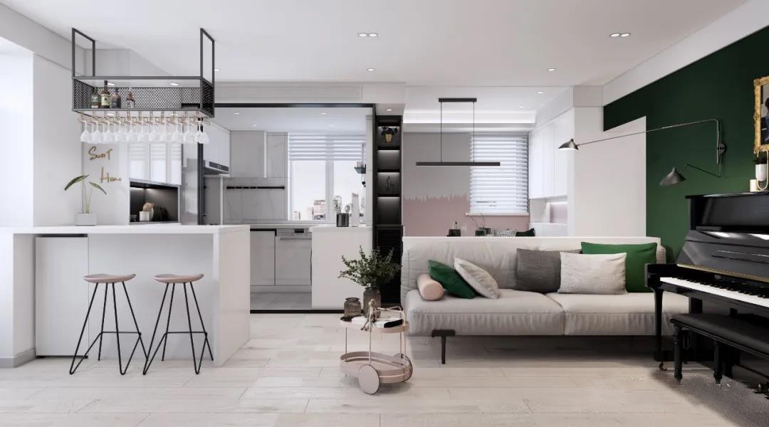 本案是一使用面积为60㎡的两居室,是屋主夫妻俩的婚房,他们都很喜欢简洁的无主灯+中央空调的设计,因此选择了全屋吊顶的方案,完工后并没有层高很低的感觉,反倒给人是一种很舒服的一体感和包裹感。拆除了次卧墙、厨房墙、客厅窗垛,让晦暗的客厅一下子变得明亮起来; 2、厨房原先的位置改为餐厅,原本客卧的位置改为厨房,形成了通透开阔的客餐厨一体的格局; 3、次卧墙体内推0.8米,改为卫生间洗手区; 4、主卧将原