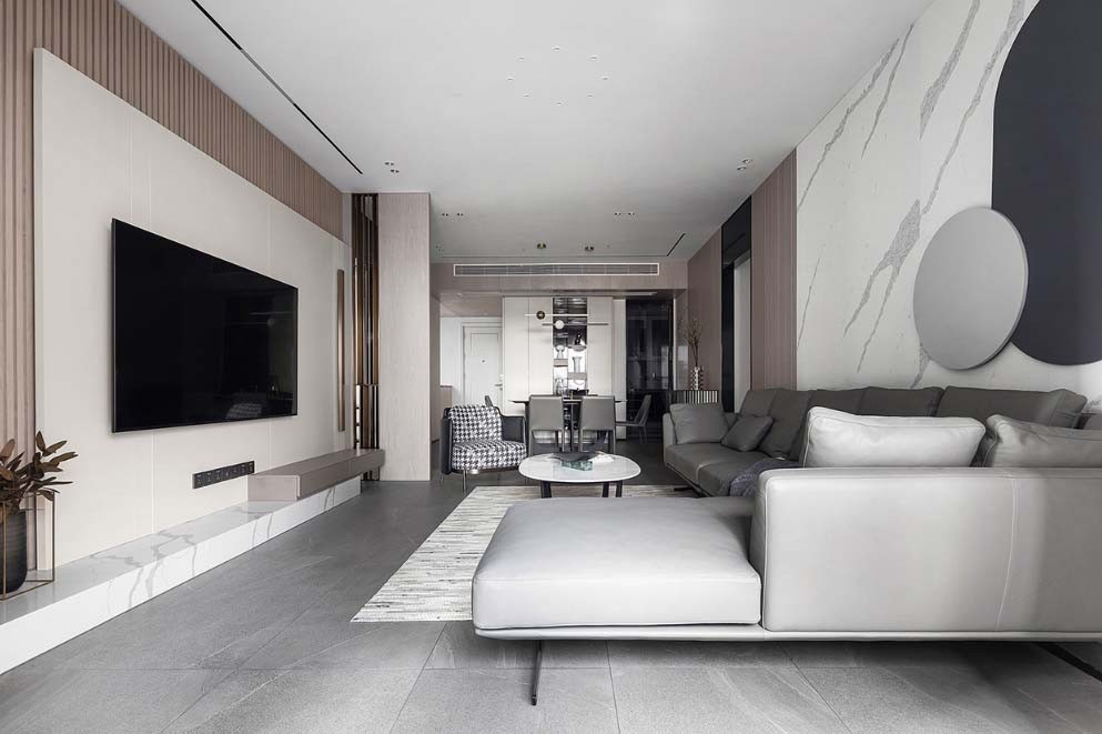 步入室内,明亮开阔的客厅空间跃入眼帘。灰咖色木格栅的紧凑感和浅色纹理岩板+护墙板的疏朗感,构成了张弛有度的设计效果,打破空间的沉闷无趣,使家居生活更加惬意舒适。