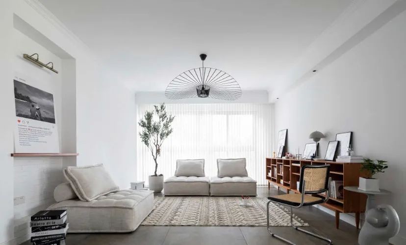 客厅选用模块化沙发,相比于常规的沙发,体积灵巧,可以自由组合,黑色伞型吊灯,点缀了随意休闲的客厅。
