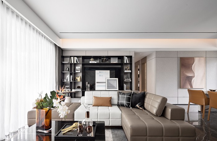灰白黑与棕色的碰撞,满足空间需求的同时,散发着古典艺术气息。空间的生命力在流动中自然流露,居住多元化场景均可完美适配。