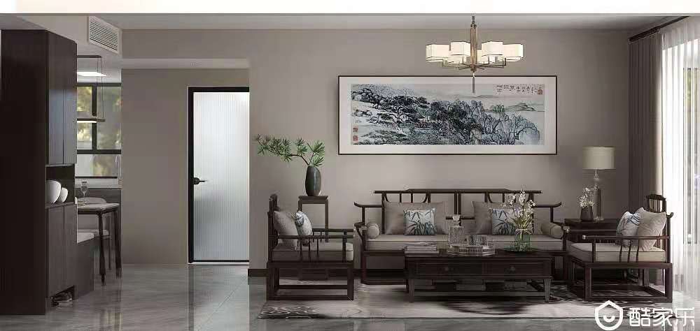 新中式的家具,加上中式山水挂画,搭配绿植,庄重典雅
