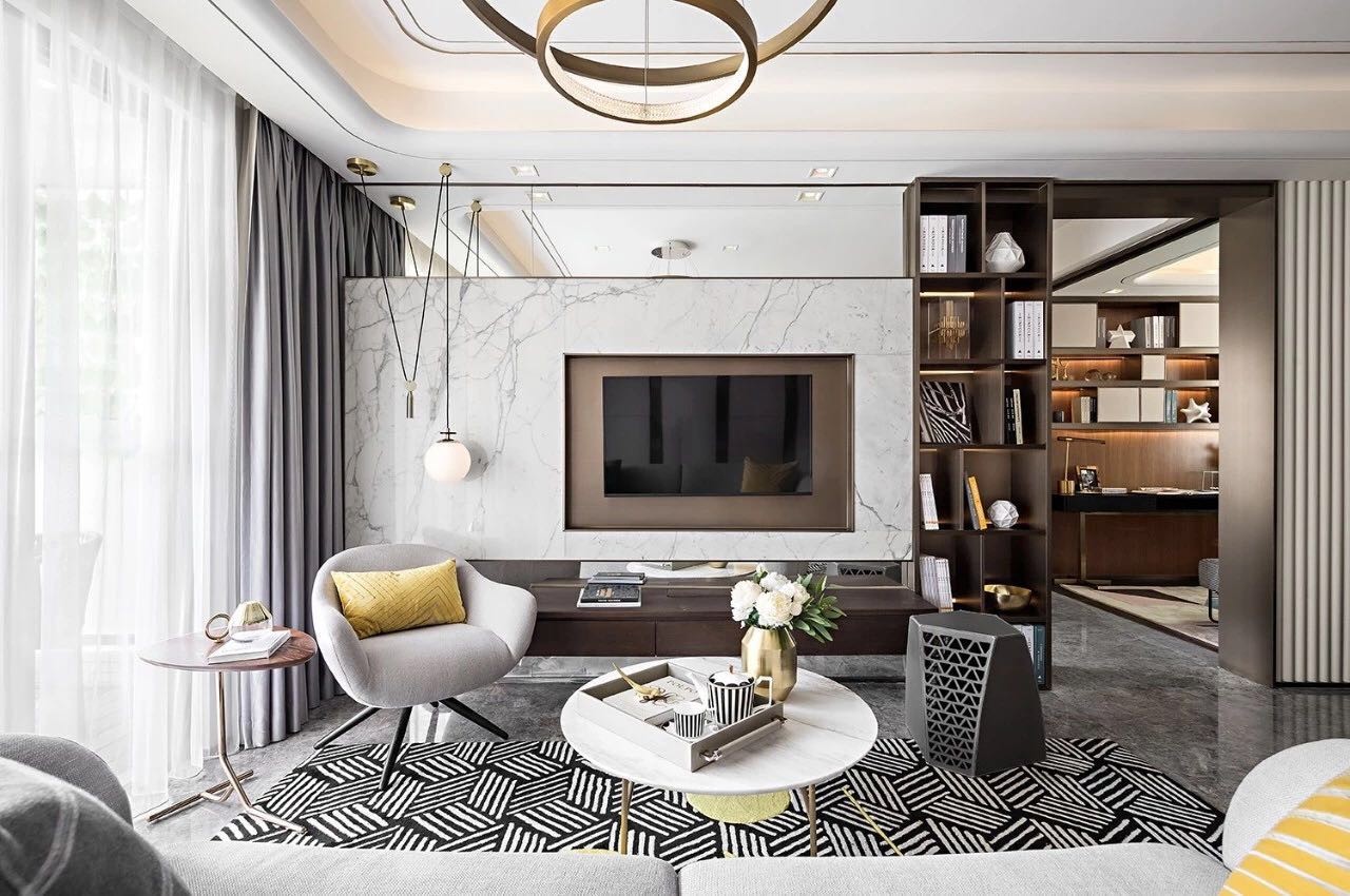 嵌入式的大理石电视背景墙,让空间在视觉上更加宽大,用地毯装饰增添温馨感。