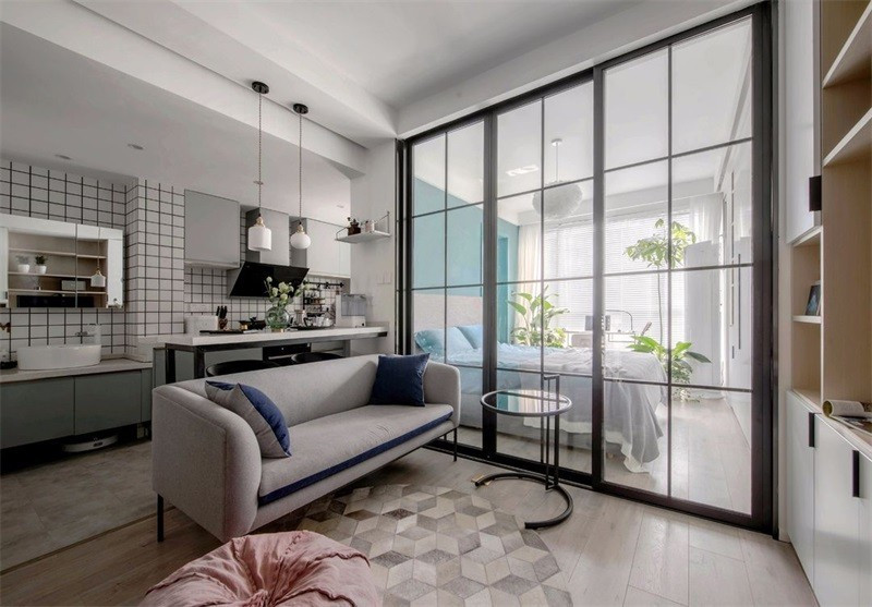 客厅区域更多是做空间动线的改变。双人小沙发靠吧台摆放,圆形小茶几边角置放,业主在进出空间时不会有太多阻隔。