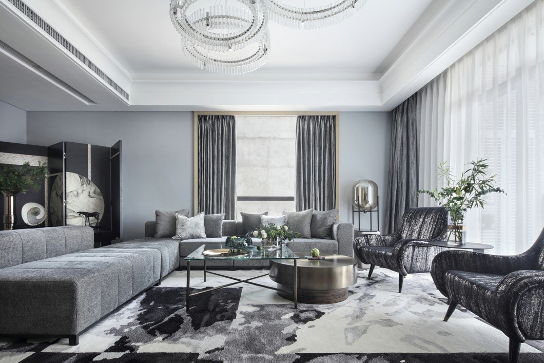 白色空间中用黑色花纹地毯修饰增添温馨感,灰色的沙发更显宁静