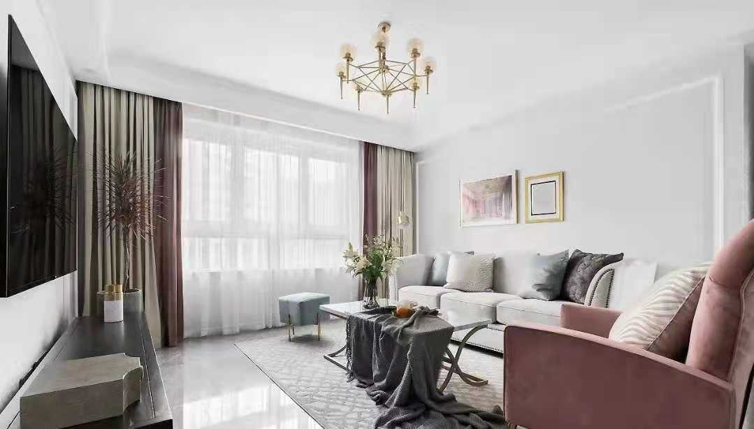 客厅以浅粉、纯白为主色调,适量的金属元素做点缀,营造柔和明朗的居住环境。