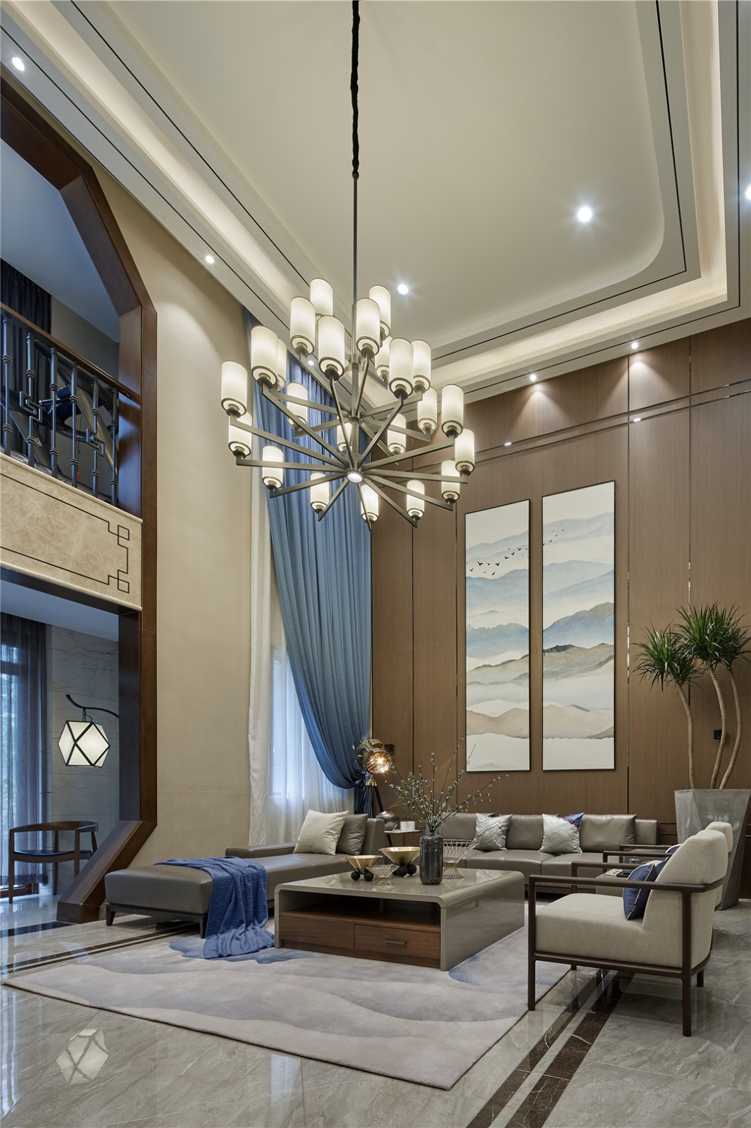 客厅是传统与现代居室风格的碰撞,中式风格的古色古香与现代风格的简单素雅自然衔接,使生活的实用性和对传统文化的追求同时得到了满足。人们不断地对中国传统文化的加深理解,逐渐促成当今新中式风格的前卫印象。以鲜艳明亮的蓝色和黄色来提升空间的时尚度,随时保持居家生活的年轻态。