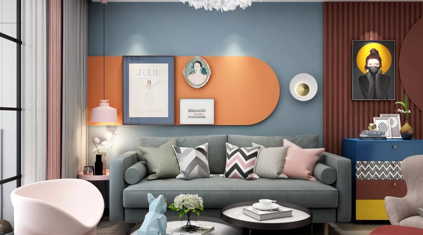 客厅空间以蓝色为主,其他颜色为点缀,使整体空间更加活泼。