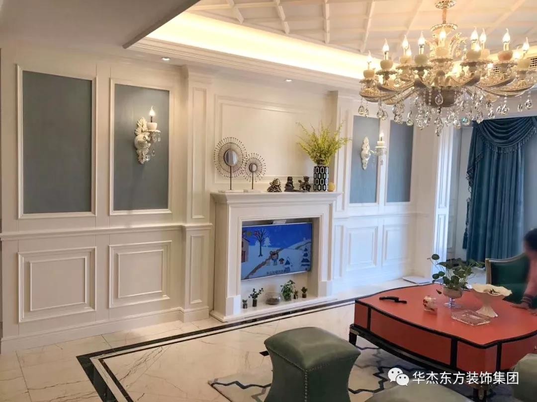 客厅顶部天花板采用石膏线勾勒出立体造型,再搭配隐藏灯带和客厅主灯来加强装饰效果,使整个空间更显立体。 地面瓷砖做了拼花设计还走了两圈波打线,用于划分空间,整齐有序又有层次感。
