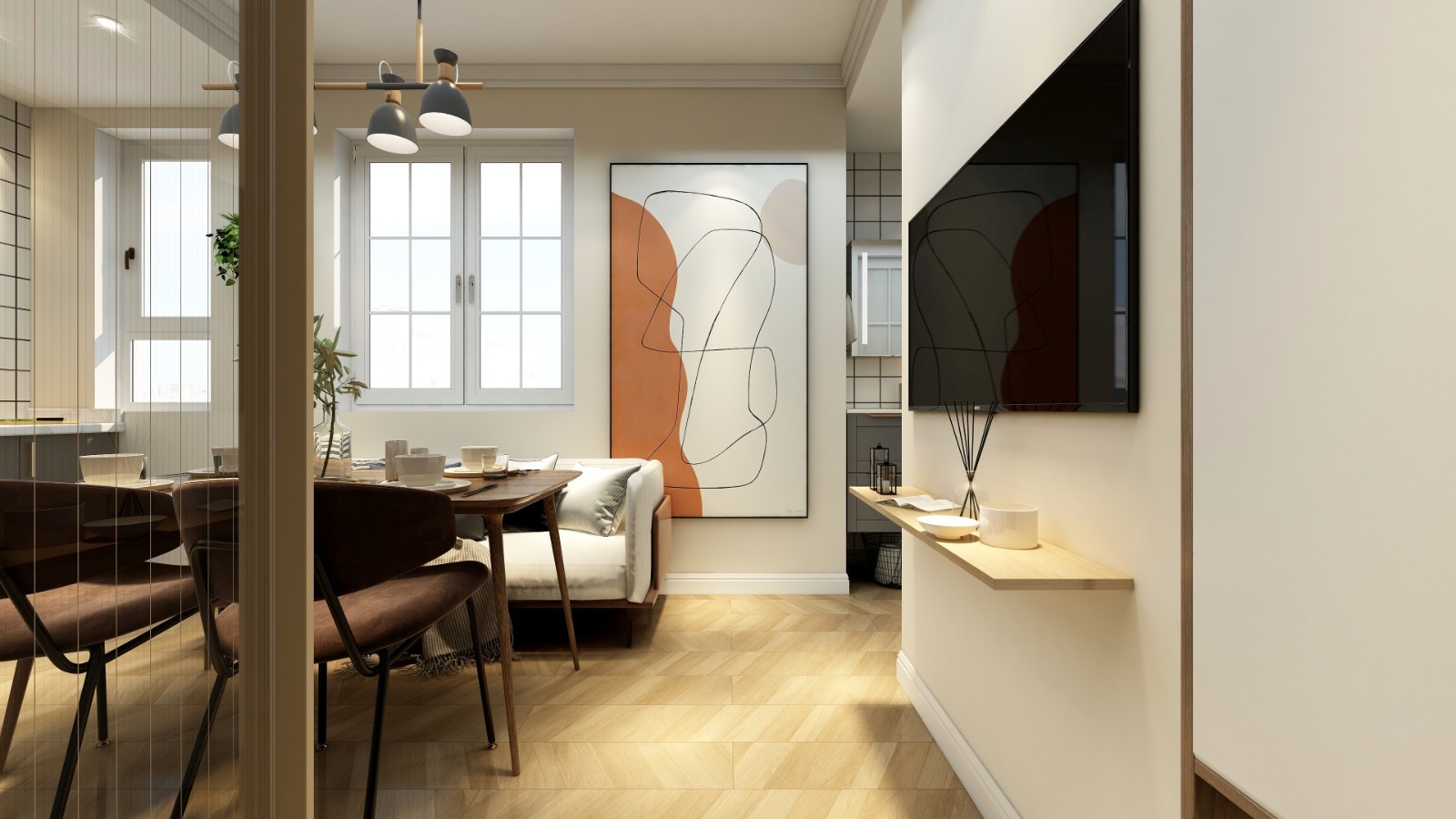 右边墙体留有一半做嵌入式鞋柜,从而增加了储物空间,另一半做为电视墙,做饭就餐也不会觉得无聊~