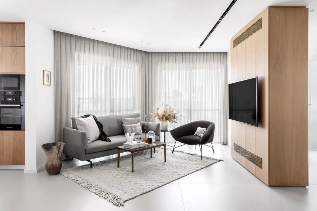 将电视背景墙与储物空间相结合,很好地利用了空间。灰色的布艺沙发造型简洁搭配黑色的扶手椅,展现了起居空间的沉浸氛围感。