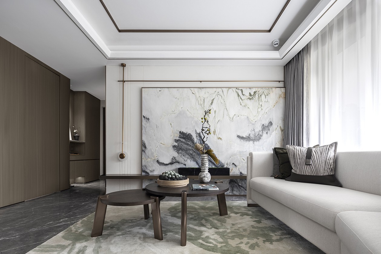 大理石背景墙光滑的质地、无序的纹路肌理,与柔软的布艺沙发在对比间凸显出空间气场的融合,在花艺的衔接下,铺叙具象化色彩与抽象化几何的艺术雅韵,予人一种清澹自在的美学意境体验。
