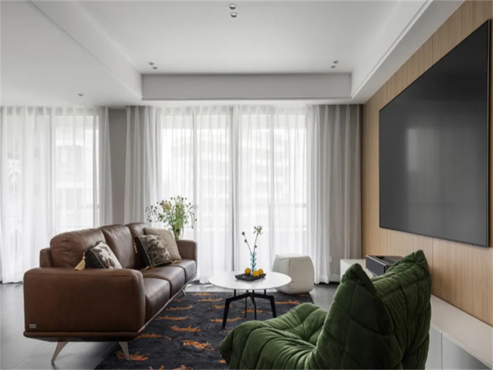 客厅家具围合式摆放,棕色皮质主沙发搭军绿色毛毛虫椅,茶几和脚蹬都选择米白色,现代加复古的基调