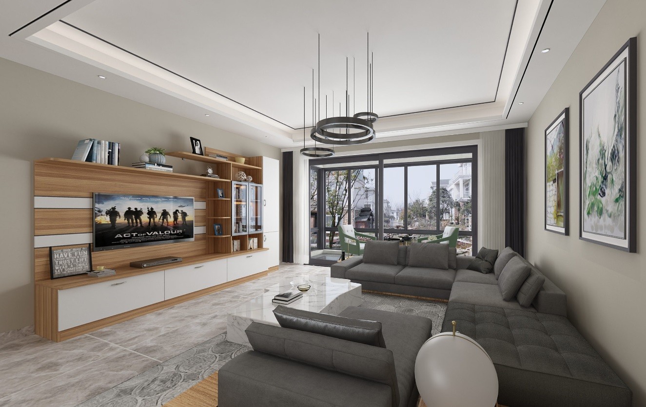 客厅是家人之间交流最多的空间,这个空间的设计就显的尤为重要!设计师考虑到这点,利用回字型吊顶使客厅更加开阔、立体、浅木色的饰面板作为电视背景墙与灰色沙发形成了很好的色彩融合,把客厅的整体氛围营造的温馨舒适。