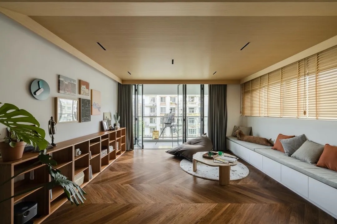 思量到孩子在家中的安全性,填平了原本客厅的下沉式错层设计。 ❤️ 地面采用深色鱼骨拼地板,顶面为了弥补地面垫高而减少的高度,选用浅色木质饰面板,一侧遮住梁的同时做内凹造型,放弃吊灯选择超薄内嵌灯,通过颜色(顶深浅色)、造型(四周吊顶木质叠级眉线、超薄内嵌灯)解决视觉上空间高度带来的压抑。最终此区域***高度为2.55米,***区域高度为2.4米。