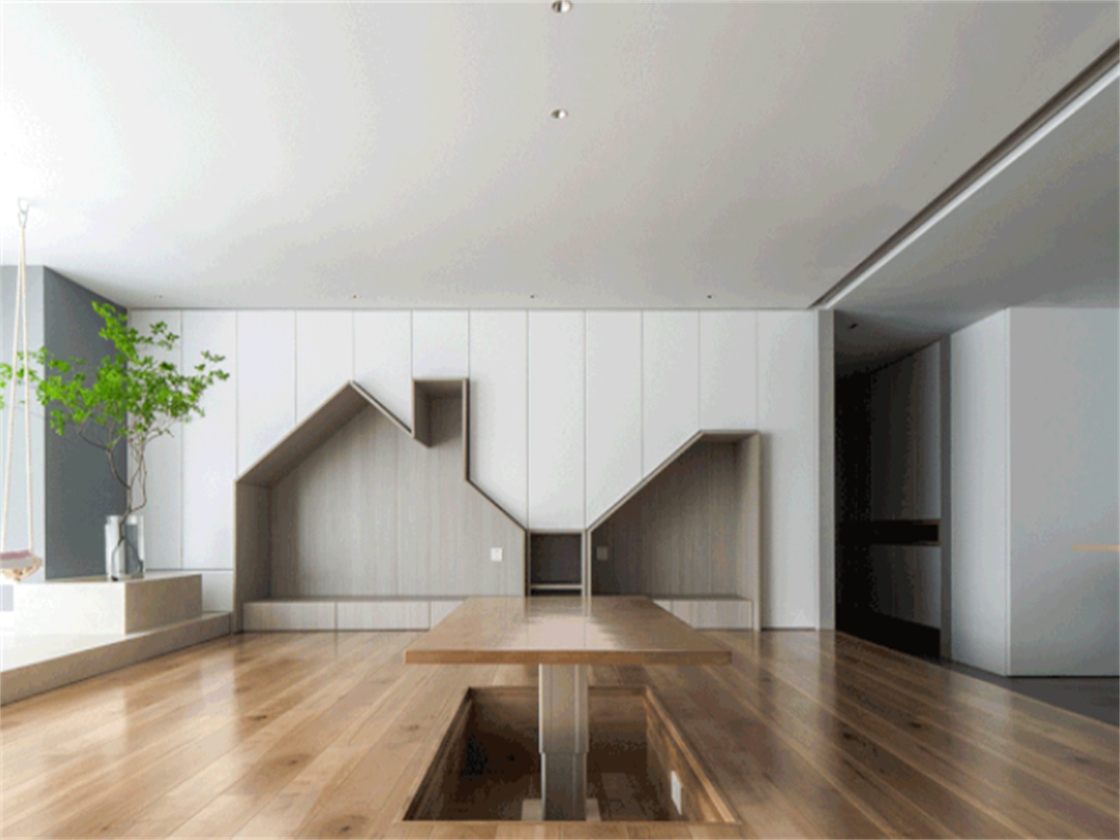 取消传统客厅的模式,将常规的茶几及沙发移除,做了地台加高处理,设计升降桌,再配上几个懒人沙发,形成躺、趴、坐随意切换的模式